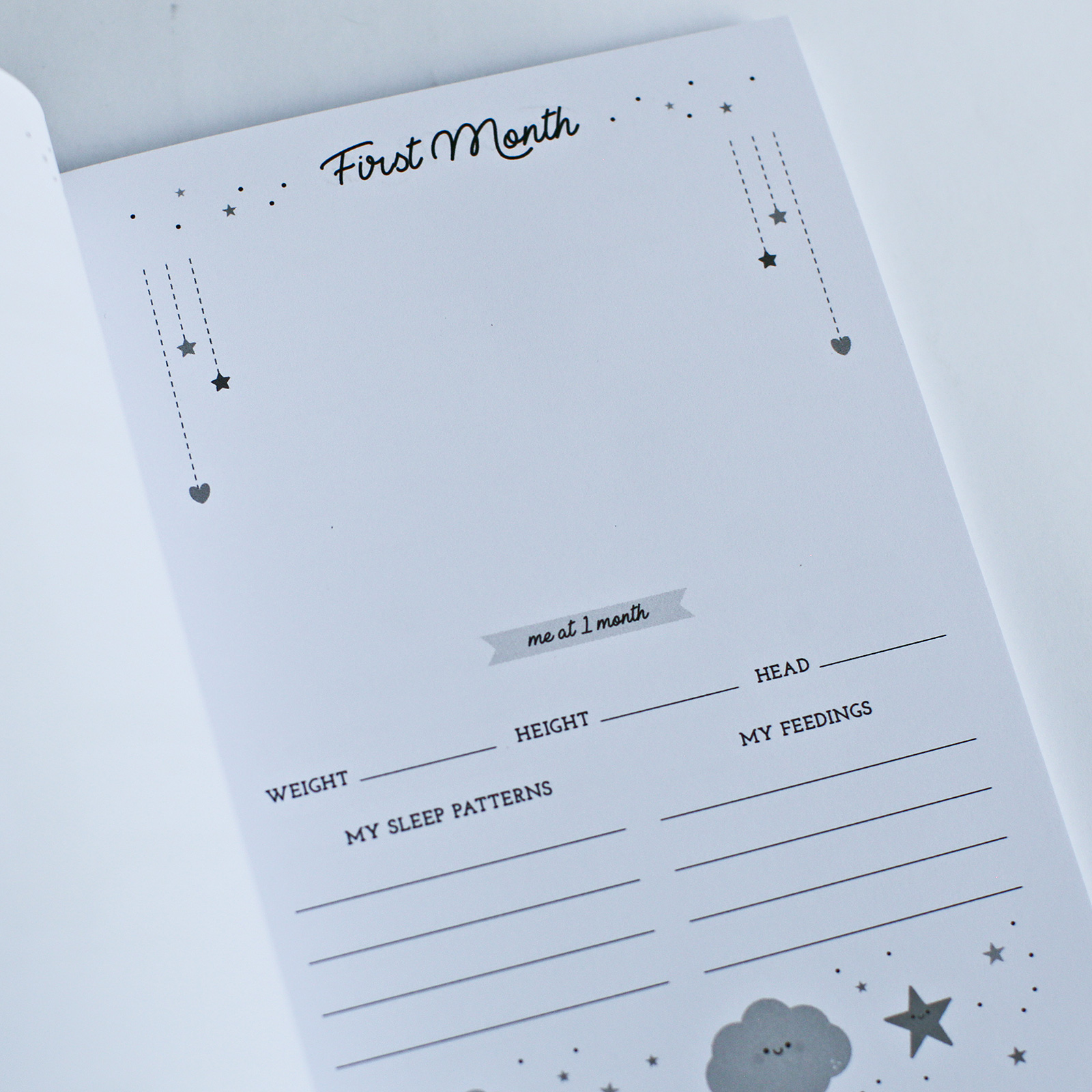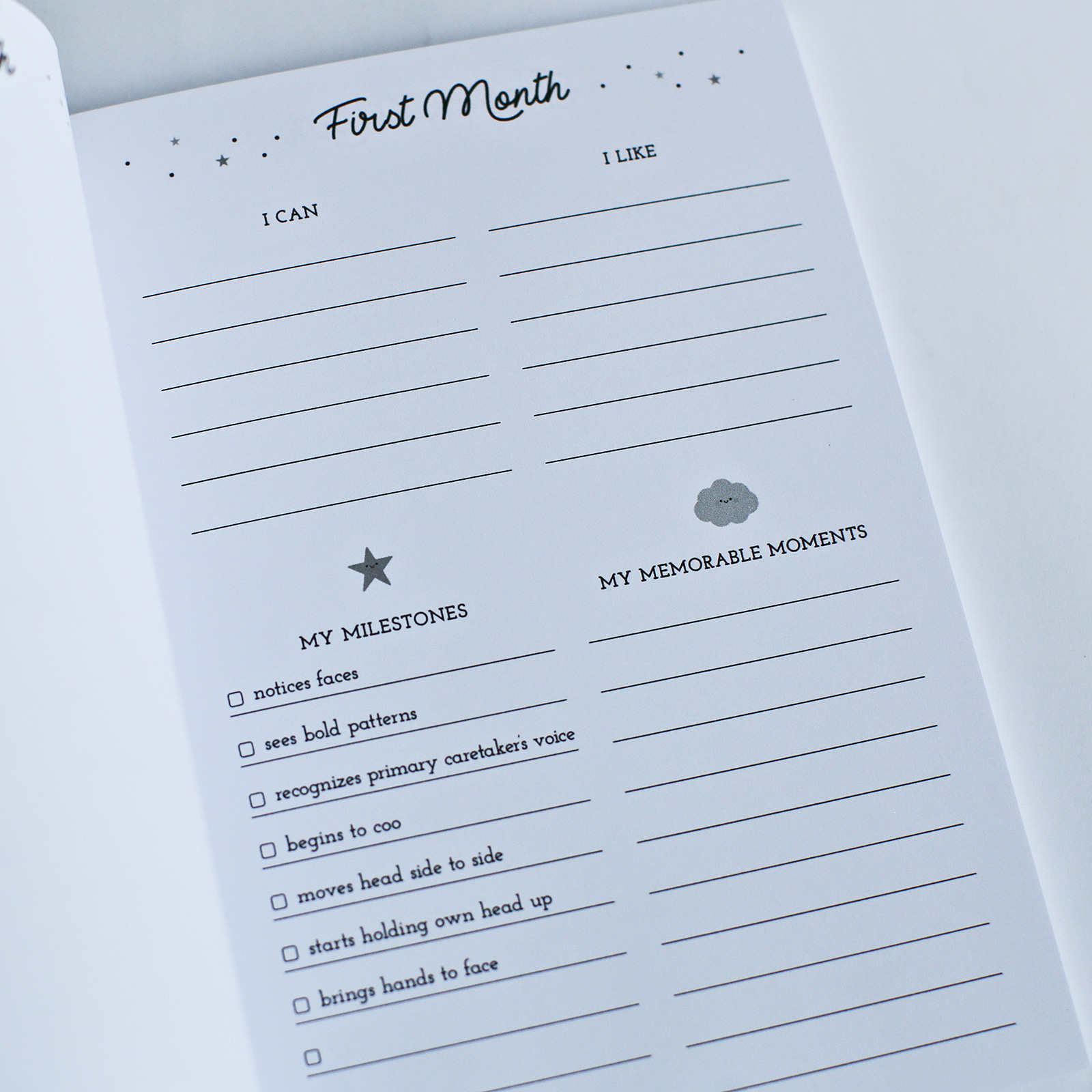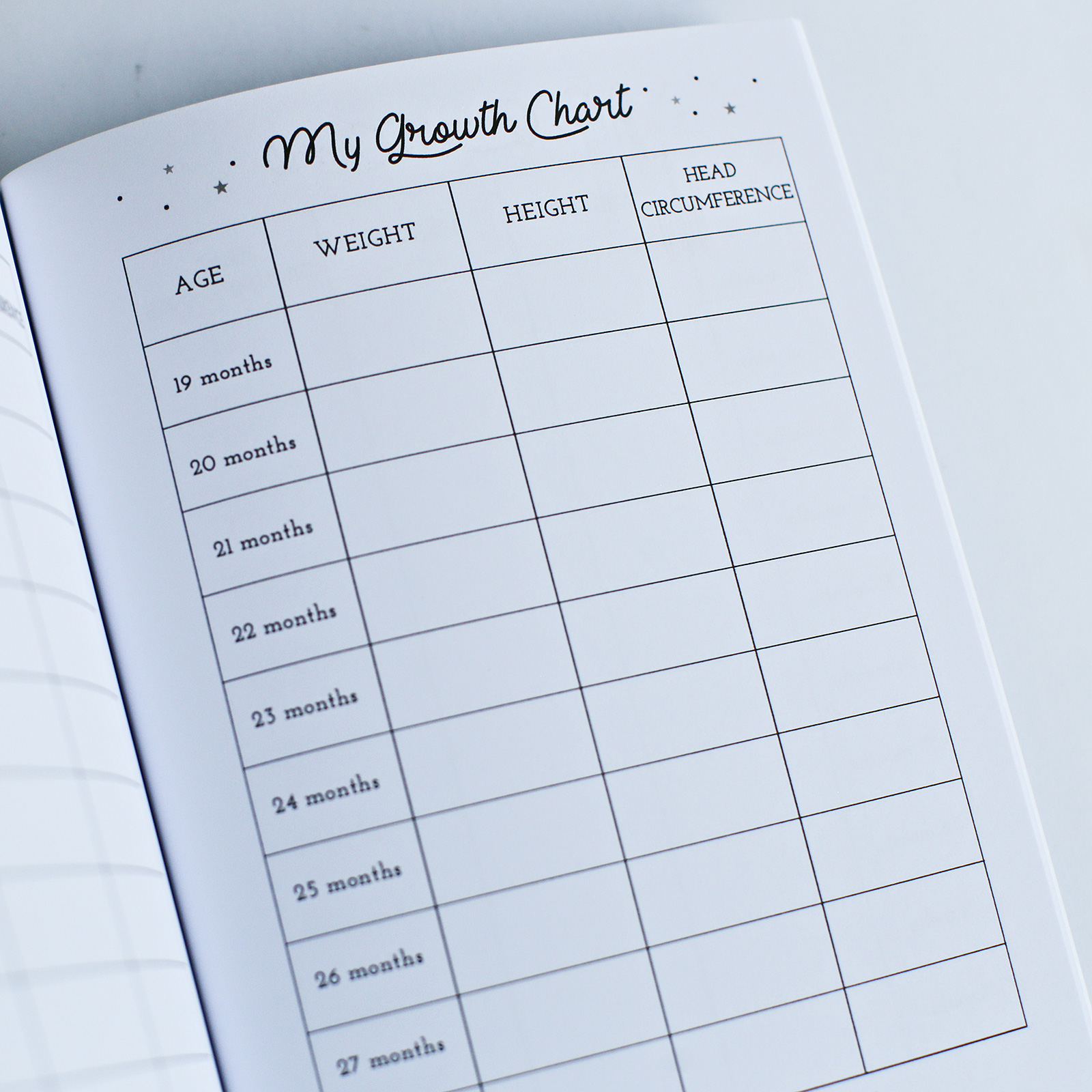 Track your little one’s growth from newborn to toddler with this Baby Book. Includes monthly checklists of baby’s milestones, a teething chart, growth chart and immunization records.