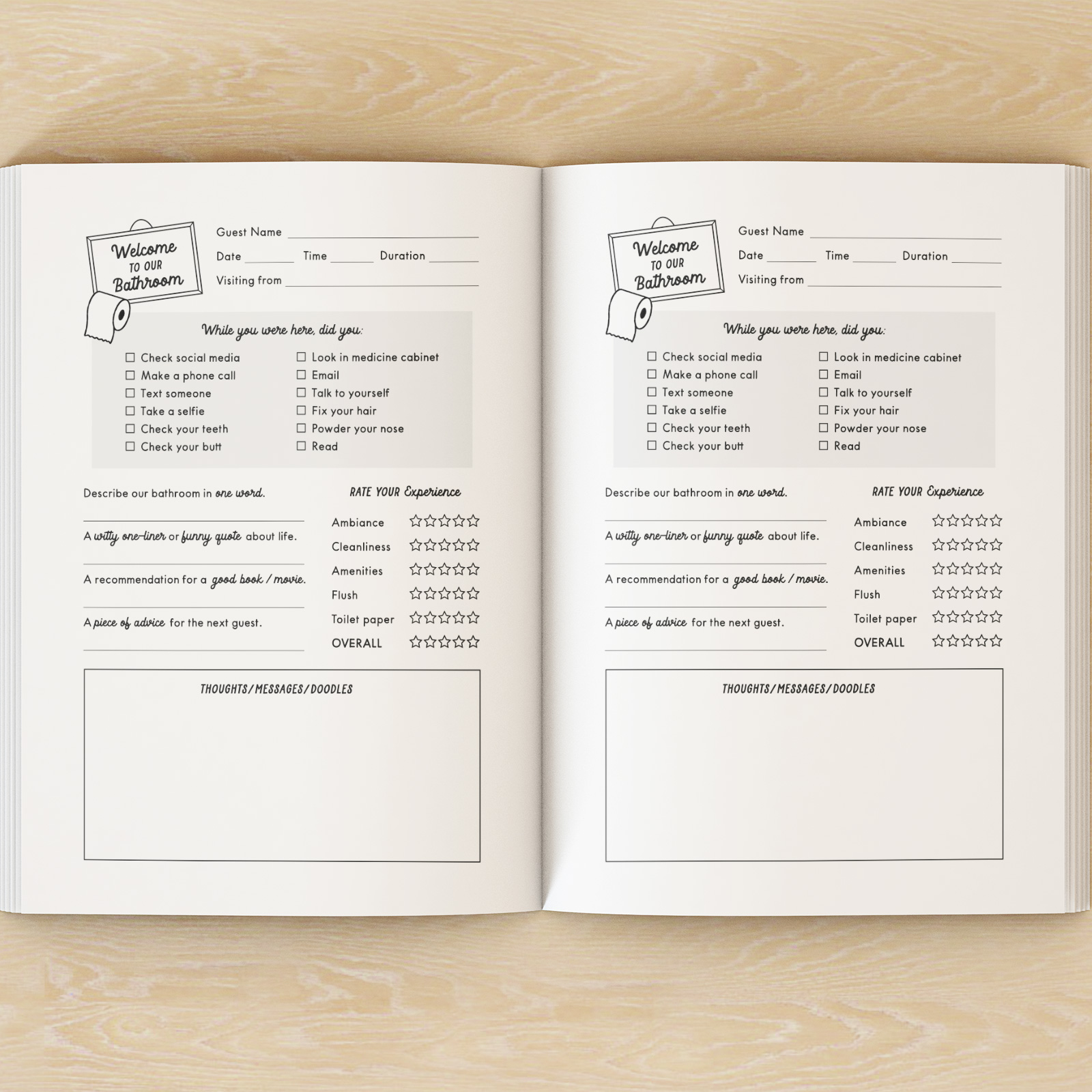 This Bathroom Guestbook makes every trip to the loo a delightful adventure. It invites guests to leave their mark with ratings, jokes, thoughts, doodles, and messages. From hilarious bathroom humor to profound ponderings, this guestbook captures the essence of every visit, providing endless entertainment for future guests.
