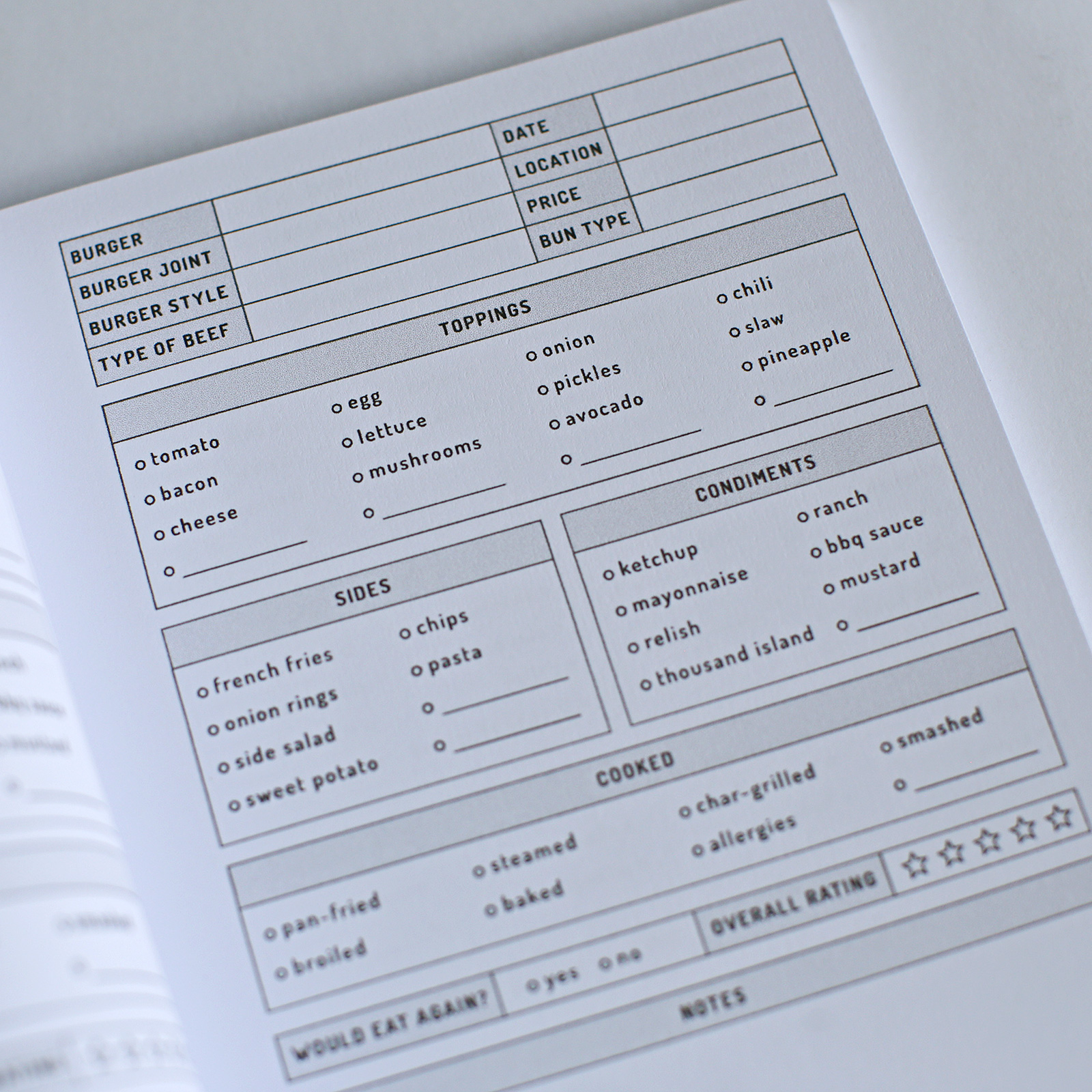 If you love burgers and have a passion for great food then this book is for you. The Burger Tasting Journal allows you to rate and compare your thoughts on various burgers that you try from different restaurants.