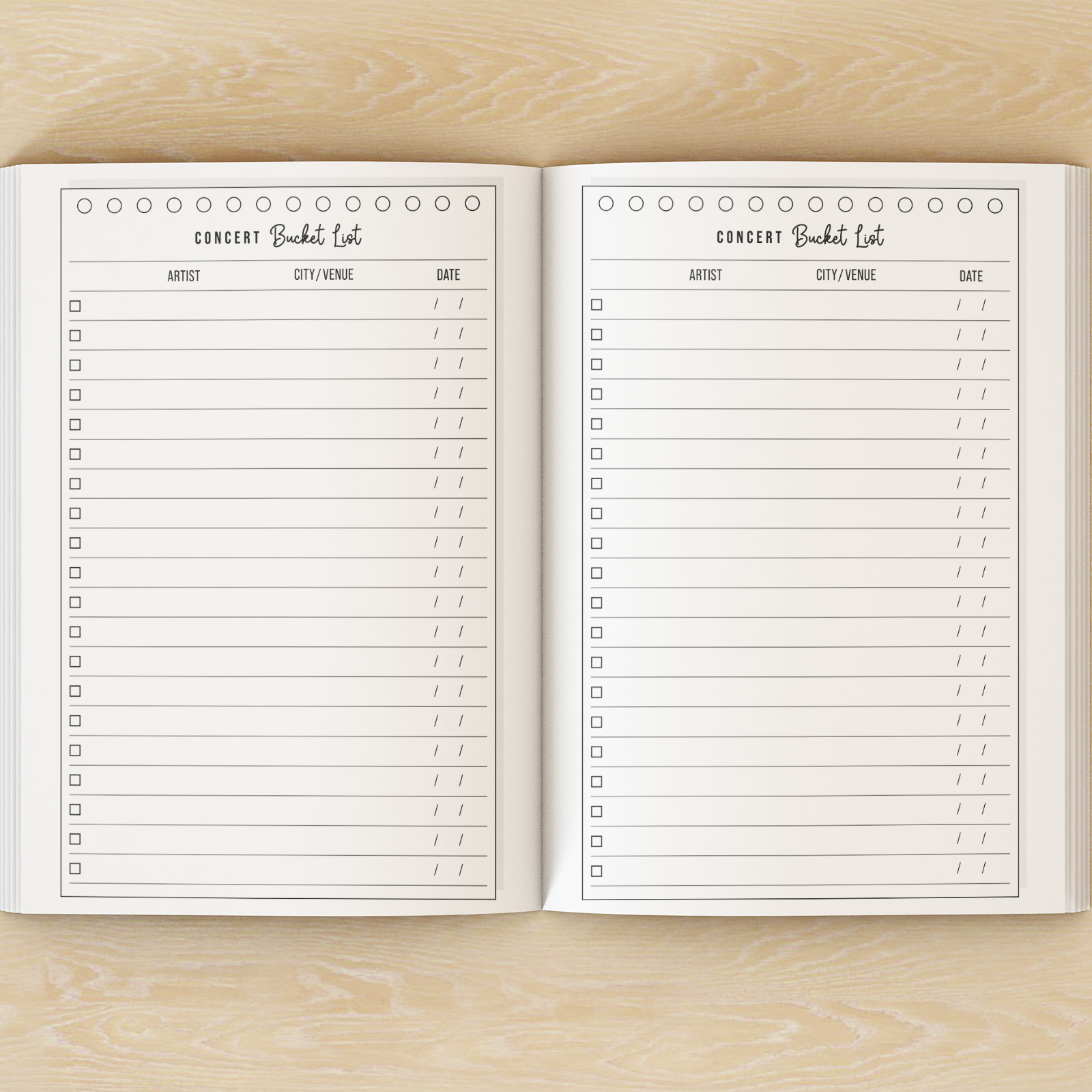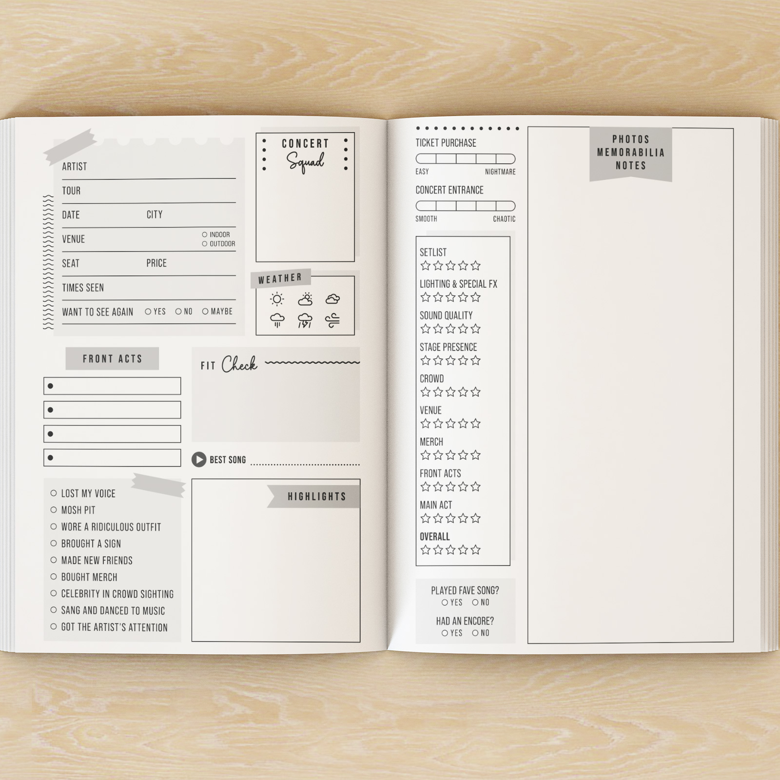 Capture every electrifying moment of your concert experiences and relive those unforgettable nights. From arena gigs to intimate venues, this Concert Journal offers dedicated spaces to document your favorite artists, songs that blew your mind, and mesmerizing moments that made your heart skip a beat.