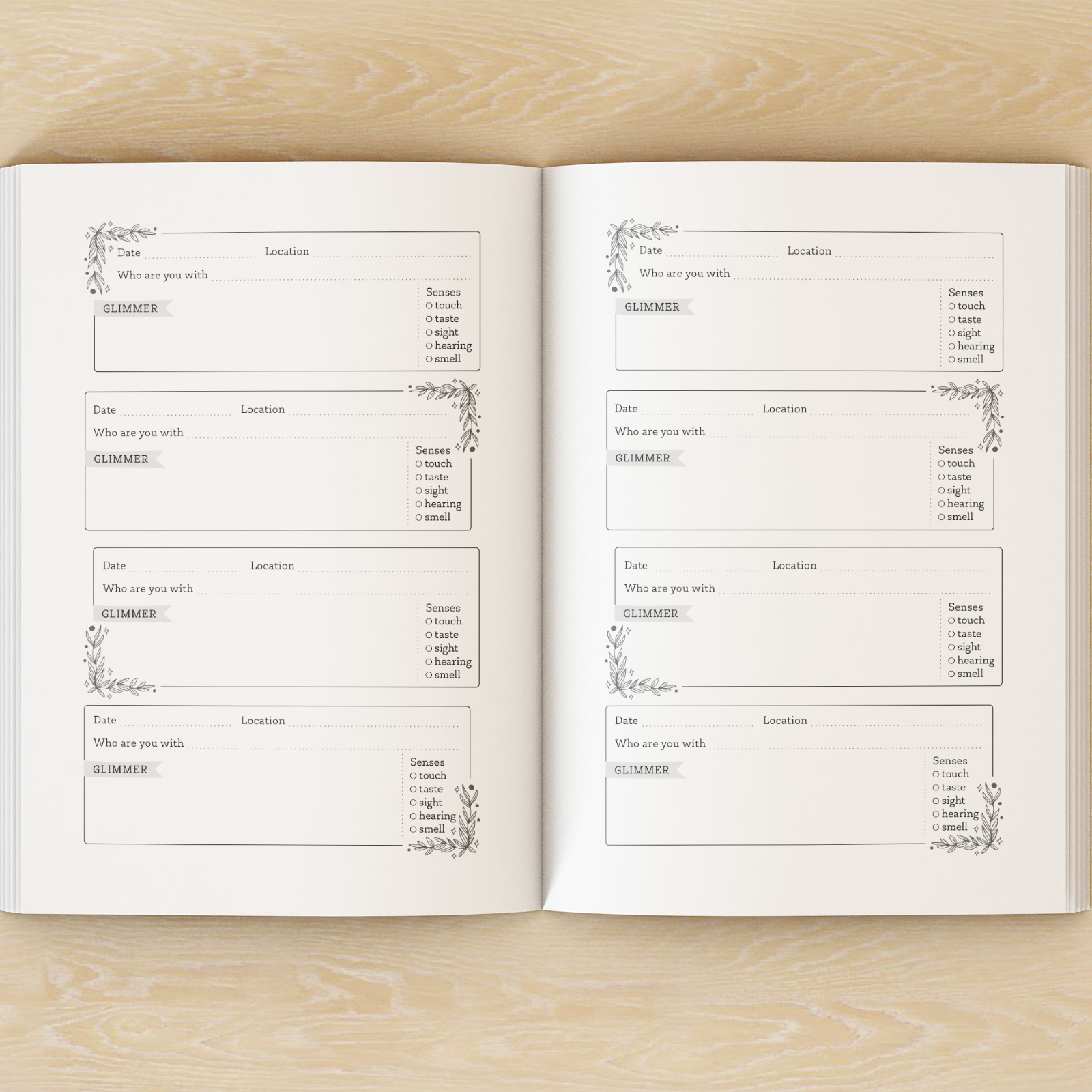 In this Glimmer Seeker Journal, you can log each glimmer along with the date, location, and company you shared it with. Dive deeper into the experience by checking off the senses you engaged — touch, taste, sight, hearing, and smell — and immersing yourself fully in the moment.