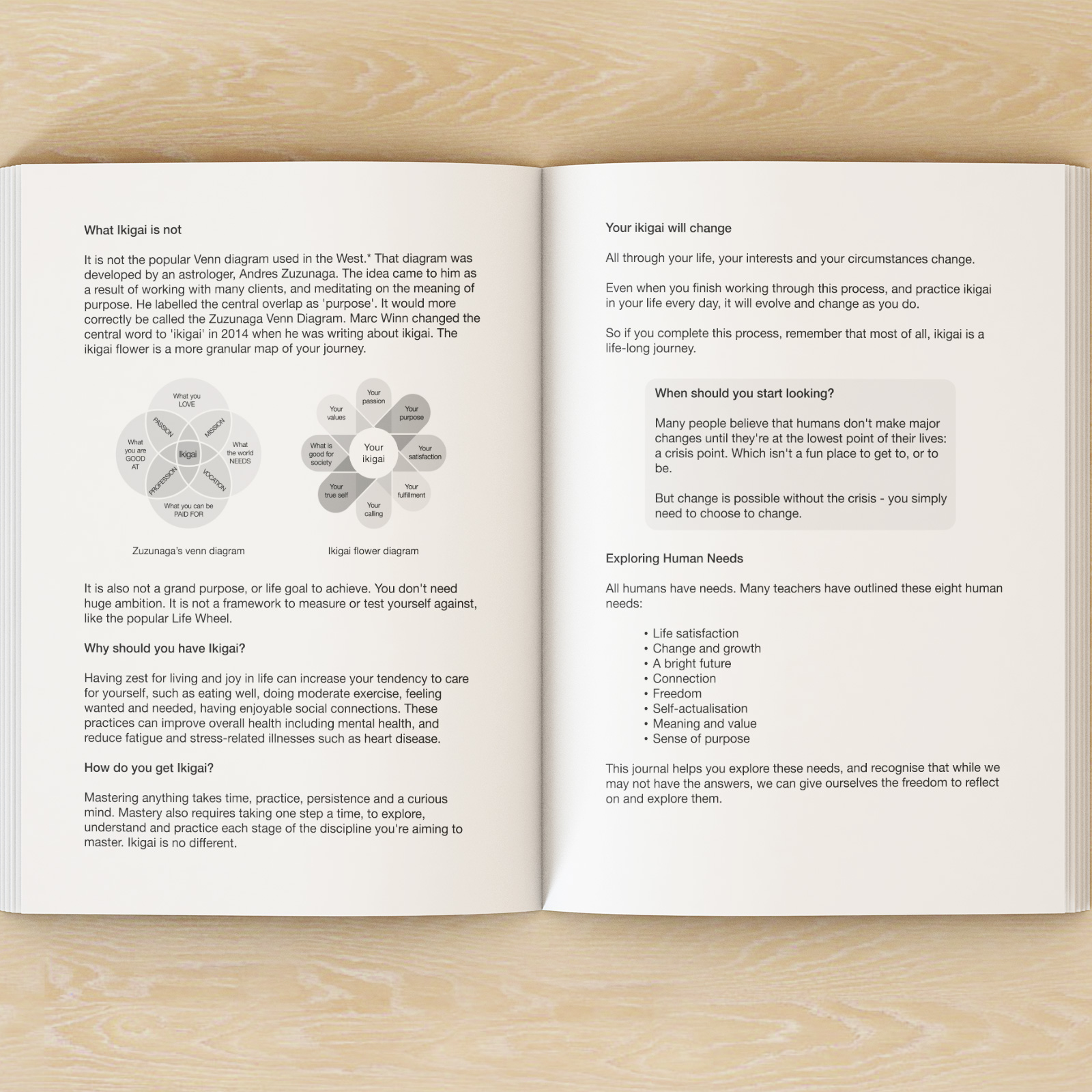 Let this Ikigai Journal help you break down your petals, find emotional blocks and identify your thoughts on change, growth, life satisfaction, connection.