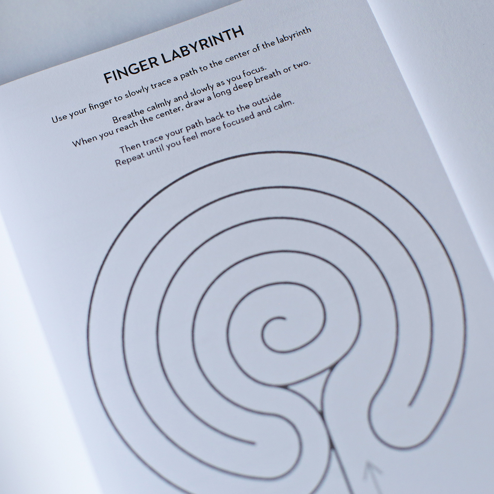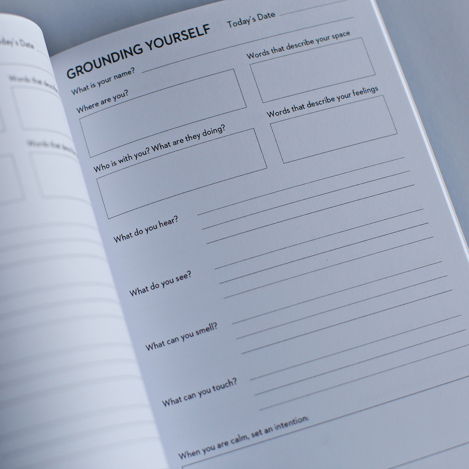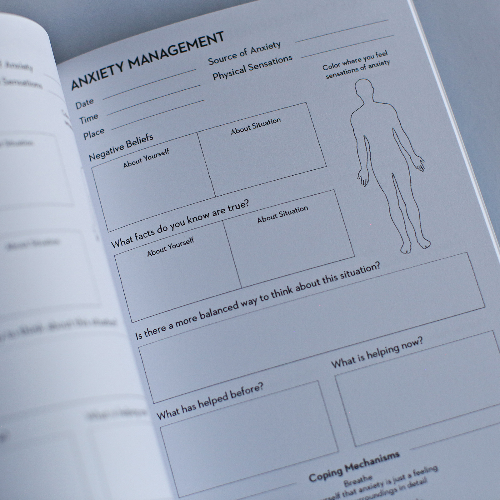 This Mindfulness Journal is inspired by several popular therapy techniques such as Cognitive Behavioral Therapy and Dialectical Behavior Therapy and also heavily borrow from Zen and Buddhist teachings. It contains workbook-like pages for grounding oneself, safe spaces, memory clouds, finger labyrinth, body scans and anxiety management logs.