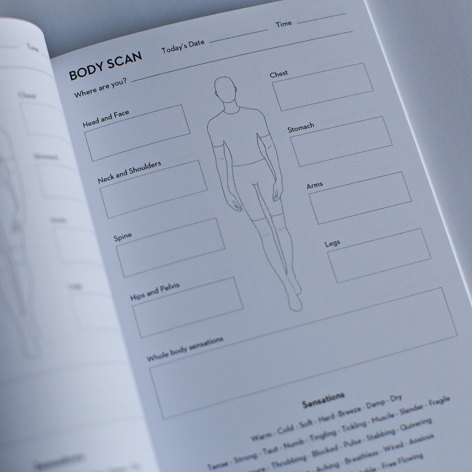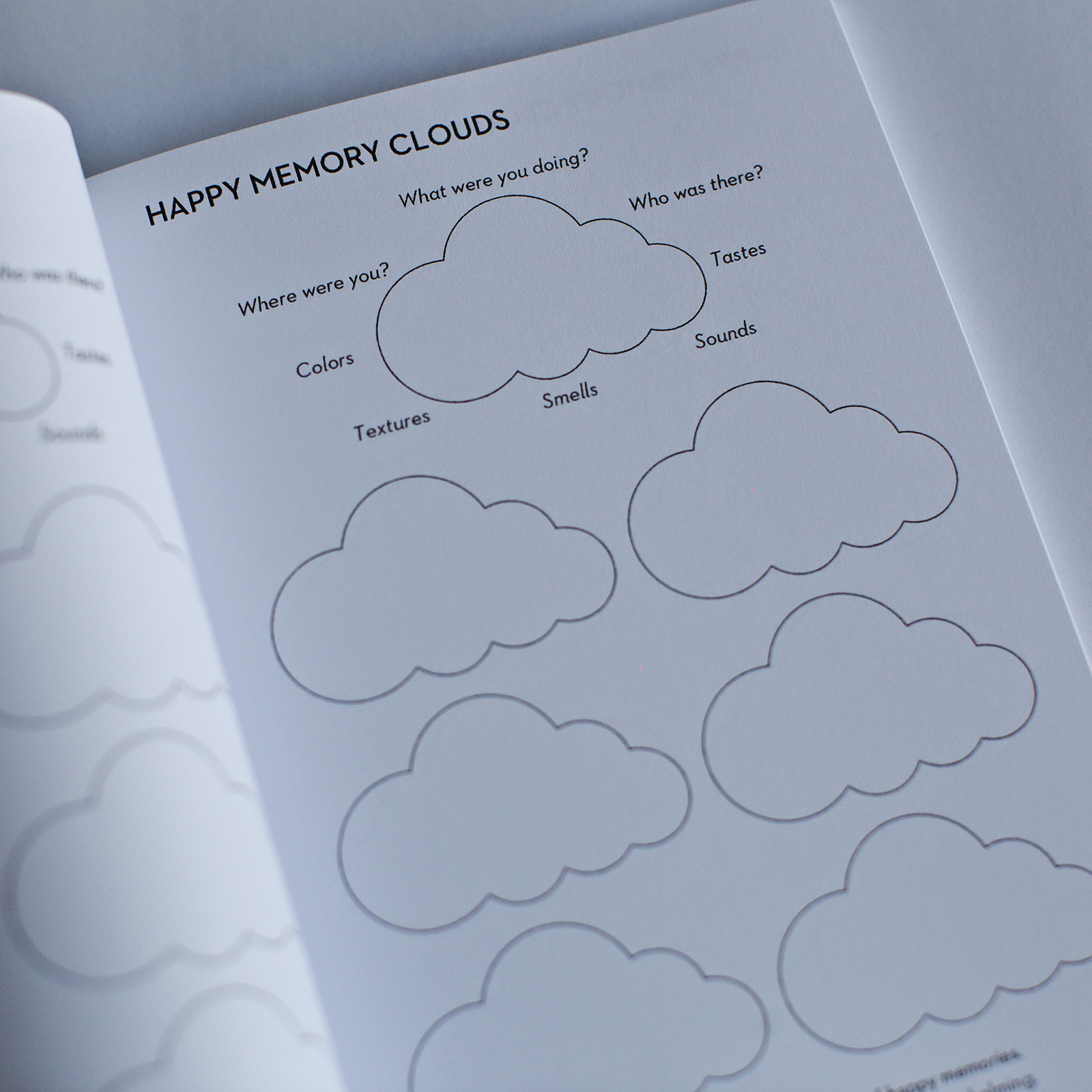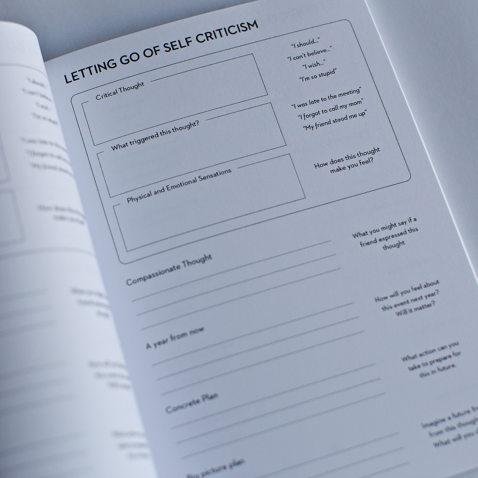 This Mindfulness Journal is inspired by several popular therapy techniques such as Cognitive Behavioral Therapy and Dialectical Behavior Therapy and also heavily borrow from Zen and Buddhist teachings. It contains workbook-like pages for grounding oneself, safe spaces, memory clouds, finger labyrinth, body scans and anxiety management logs.