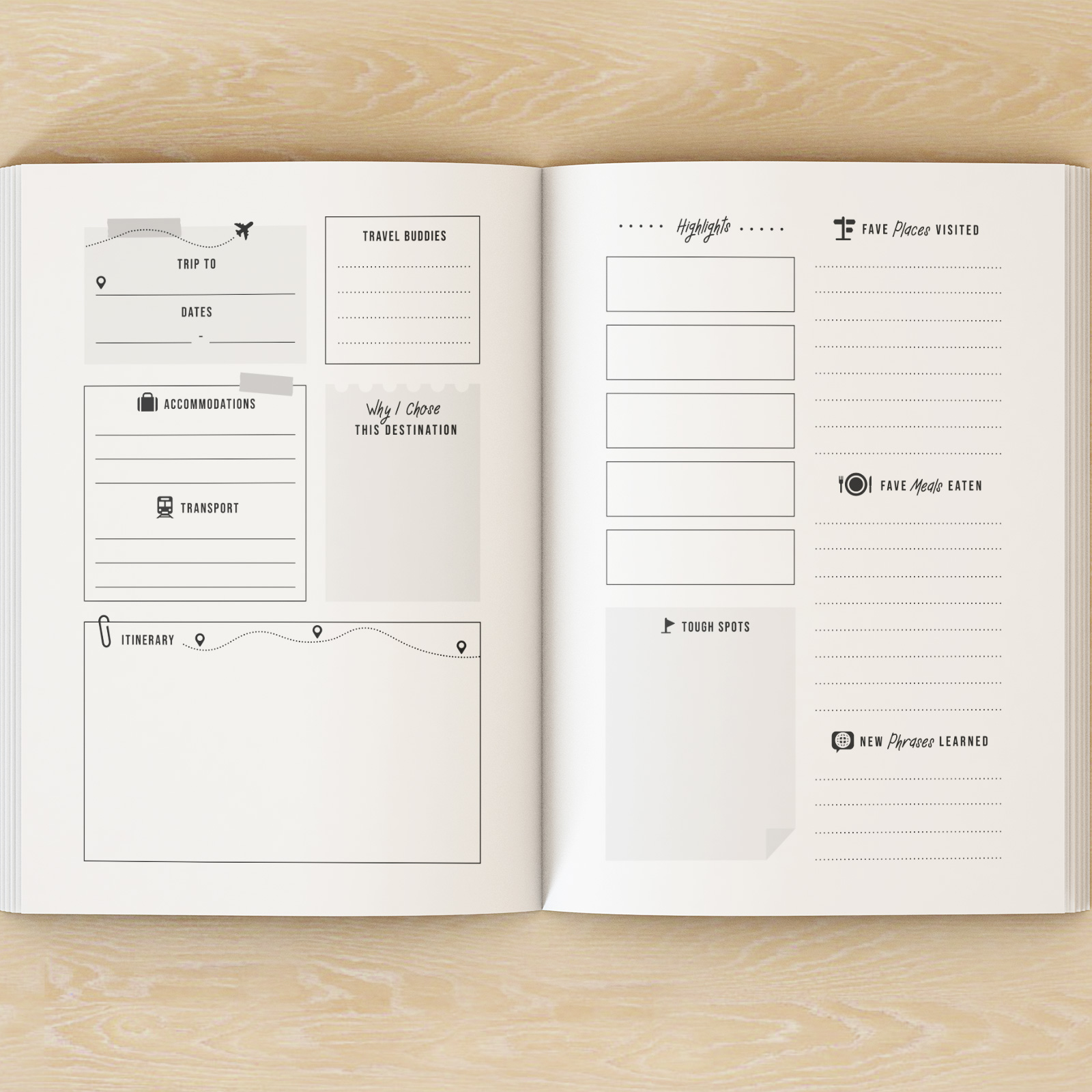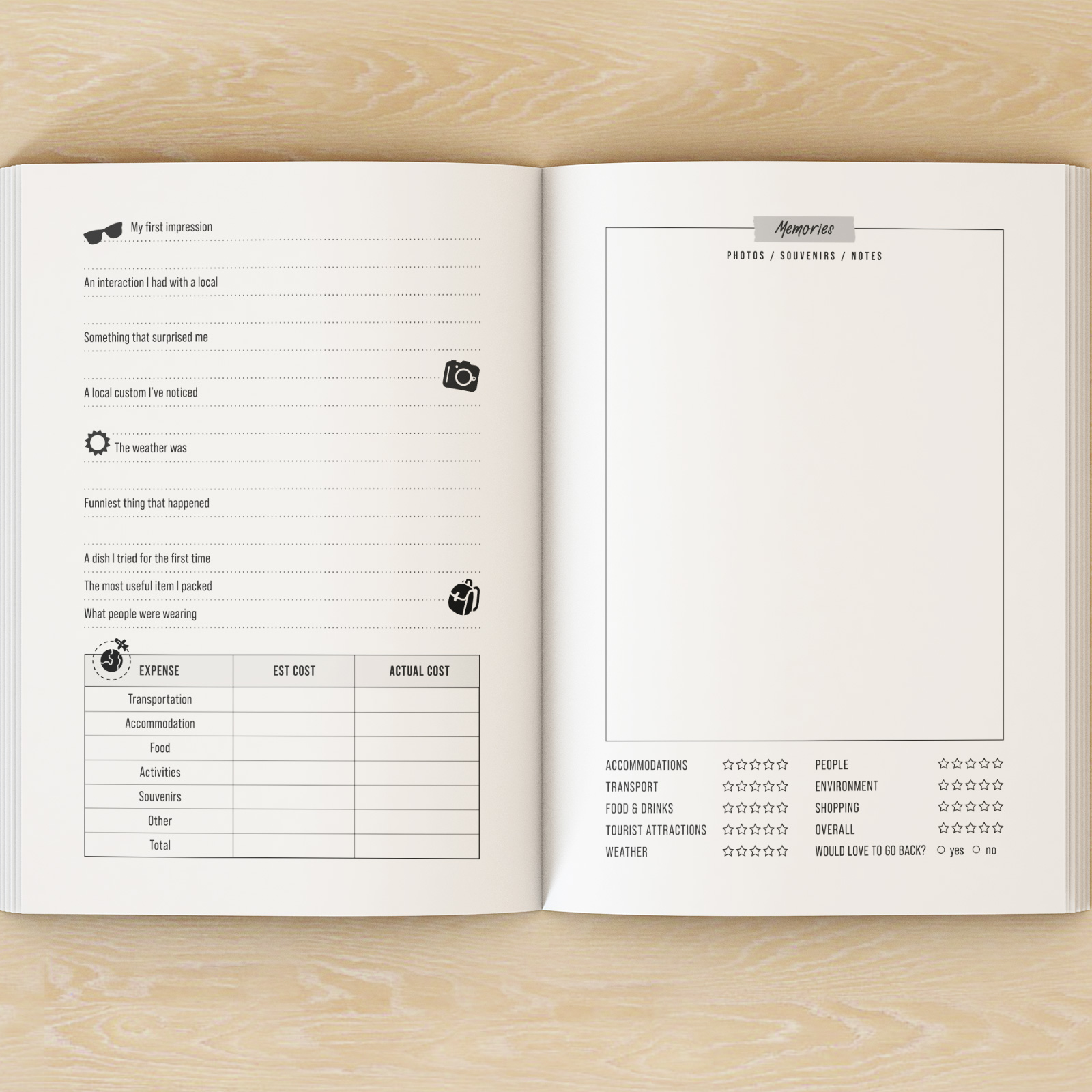 From recording fascinating encounters with locals to jotting down mouth-watering culinary escapades, this journal encourages you to delve deeper into the heart of every place you visit. And don’t worry about forgetting any important details – handy prompts and questions are included to guide your writing.